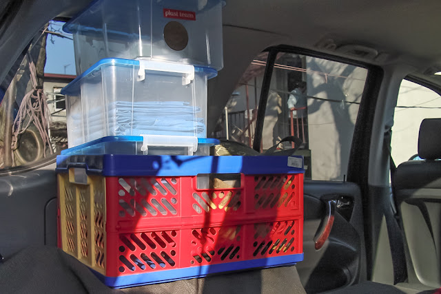 Bagażnik, jak widać, zasadniczo pomieścił cały biwakowy osprzęt – nie było nawet potrzeby składać foteli, co zostawia nam trochę luzu na dalsze bagaże. Wolny pozostał też cały dach. Dla wygody, zamiast bagaży tym razem spakowaliśmy puste – lub prawie puste pudełka. Dają dobre obeznanie co do dostępnego miejsca, a dużo łatwiej je przenosić przy kolejnych ustawieniach.