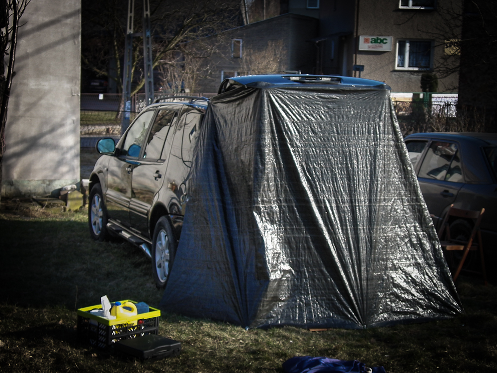 Za namiot służy zwykła plandeka, przymocowana gumami bagażowymi do relingu i przybita śledziami do ziemi.