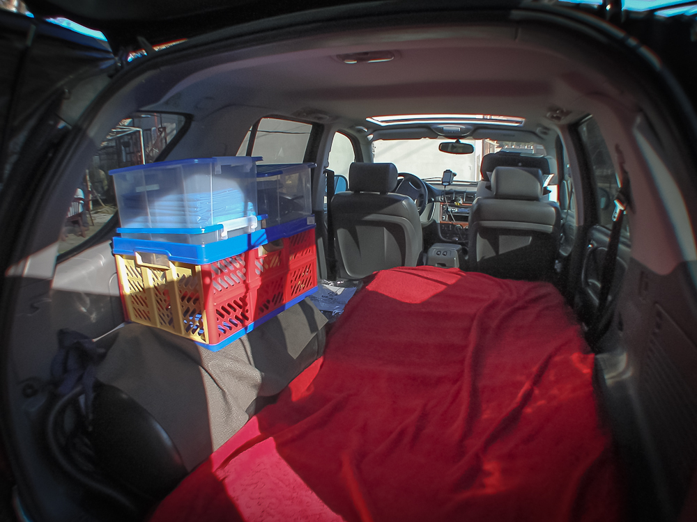 Bagażnik, jak widać, zasadniczo pomieścił cały biwakowy osprzęt – nie było nawet potrzeby składać foteli, co zostawia nam trochę luzu na dalsze bagaże. Wolny pozostał też cały dach. Dla wygody, zamiast bagaży tym razem spakowaliśmy puste – lub prawie puste pudełka. Dają dobre obeznanie co do dostępnego miejsca, a dużo łatwiej je przenosić przy kolejnych ustawieniach.
